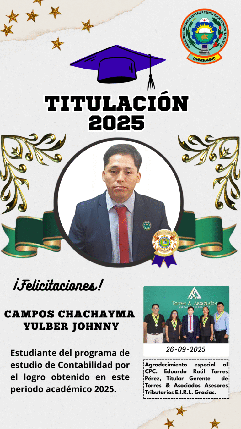 "Campos Chachayma Yulber Johnny" del programa de estudio de Contabilidad, por el Logro Obtenido y el inicio en esta nueva etapa Profesional.👨🎓🥳