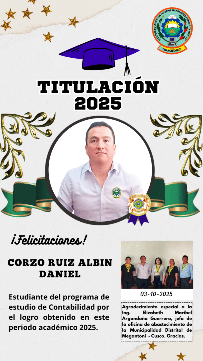 "Corzo Ruiz Albin Daniel" del programa de estudio de Contabilidad, por el Logro Obtenido y el inicio en esta nueva etapa Profesional.👨🎓🥳