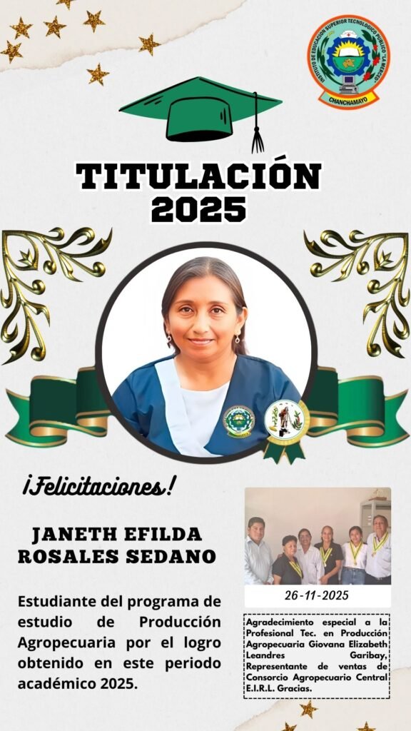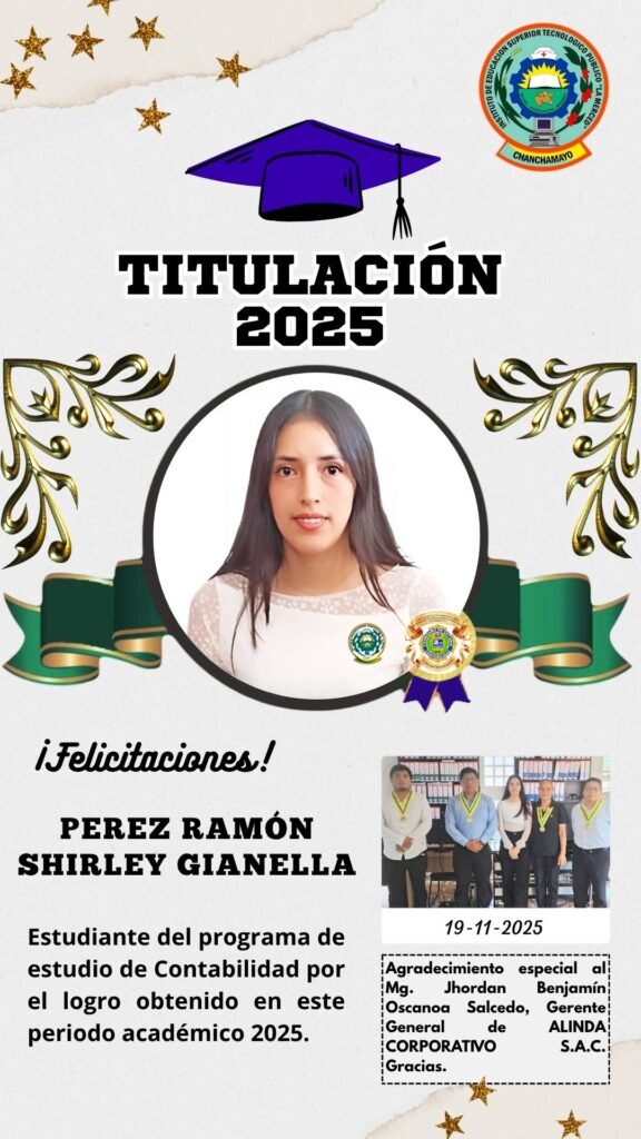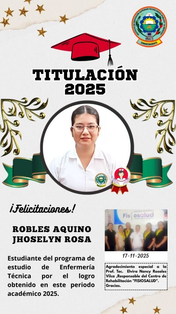 Con gran satisfacción, felicitamos a nuestros titulados: ✅ CHAVEZ RODRIGUEZ HENY SILVANA – Enfermería Técnica ✅ CAMPOS CHACHAYMA LIDIA MEDALID – Enfermería Técnica ✅ VENEGAS SULLCA MARIELA – Enfermería Técnica ✅ SULLCARAY LOAYZA AMANDA – Enfermería Técnica ✅ PIMENTEL VELIZ KENYI RONALDIÑO – Contabilidad Hoy celebramos el fruto de su disciplina y perseverancia: la obtención de sus títulos profesionales. ¡Que esta meta alcanzada abra las puertas a nuevos y mayores desafíos para cada uno de ustedes!